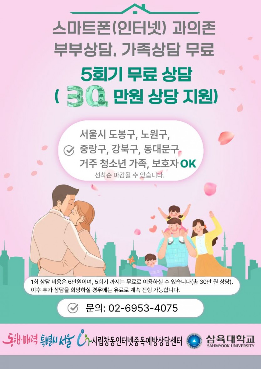 [홍보_신청가능] 부부 및 가족 상담 5회기 무료 지원(선착순 접수중) 페이지 정보 작성자 : 창동iwill 조회수 : 1,024회 작성일 : 25-08-31 본문 <전화 신청 후 진행 절차 안내> 접수면접 진행 내부회의를 통한 상담 배정 상담 진행<상담 비용 안내> 접수면접 비용: 20,000원 개인상담 성인: 20,000원 청소년: 10,000원 부부상담·가족상담: 가족당 60,000원* 무료 5회기 지원하고자 합니다.(선착순)문의: 상담치유팀 담당 남가인 02-6953-4075 목록 이전글시립창동인터넷중독예방상담센터 채용(예방연구팀 팀장, 예방연구팀 담당) 서류전형 합격자 공고 25.09.03 다음글2025년 디지털 미디어 과의존 극복수기 및 예방 슬로건 공모전 안내025년 디지털 미디어 과의존 극복수기 및 예방 슬로건 공모전 안내 25.08.30
