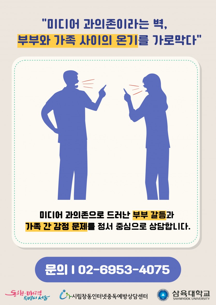 [홍보_신청가능] 2026년 디지털미디어 개인상담, 가족상담, 부부상담 홍보 페이지 정보 작성자 : 창동iwill 조회수 : 531회 작성일 : 25-08-31 본문 <전화 신청 후 진행 절차 안내> 접수면접 진행 내부회의를 통한 상담 배정 상담 진행<상담 비용 안내> 접수면접 비용: 20,000원 개인상담 성인: 20,000원 청소년: 10,000원 부부상담·가족상담: 가족당 60,000원문의: 상담치유팀 담당 남가인 02-6953-4075 목록 이전글시립창동인터넷중독예방상담센터 채용(예방연구팀 팀장, 예방연구팀 담당) 서류전형 합격자 공고 25.09.03 다음글2025년 디지털 미디어 과의존 극복수기 및 예방 슬로건 공모전 안내025년 디지털 미디어 과의존 극복수기 및 예방 슬로건 공모전 안내 25.08.30